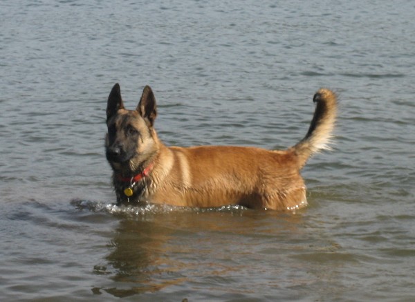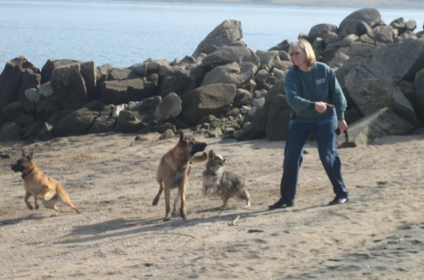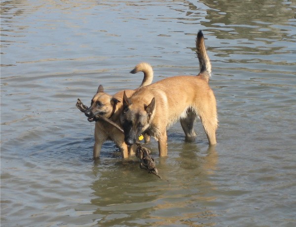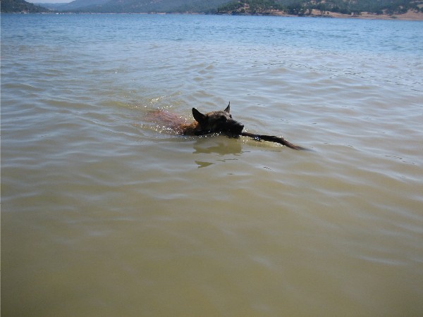 | Ran helps Bjorn retrieve a big stick at Folsom Lake. | |