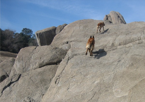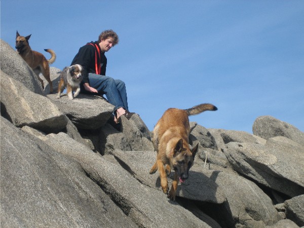 | Kirt and the Mals do some freestyle rock climbing. We don't know how that little Aussie got up there with the REAL dogs. | |